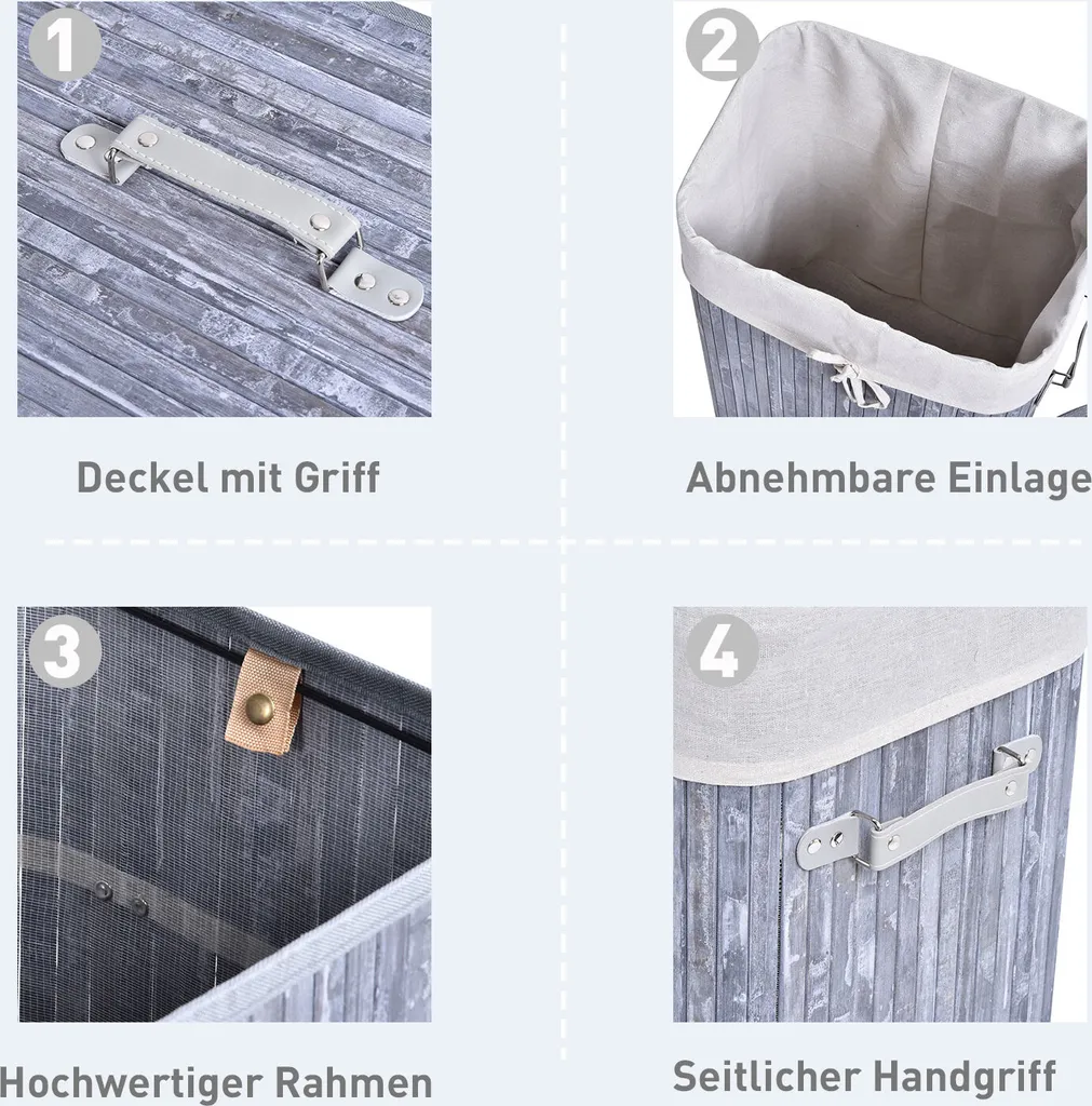 Schreibe die erste Rezension für „HOMCOM Wäschekorb, Wäschebox, Wäschesammler Mit Deckel, Segeltuchsack, Waschbarem Wäschesack, Mit Griffen, Bambus , Faltbar, 72L, Grau, 40 X 30 X 60 Cm“ Antwort abbrechen
