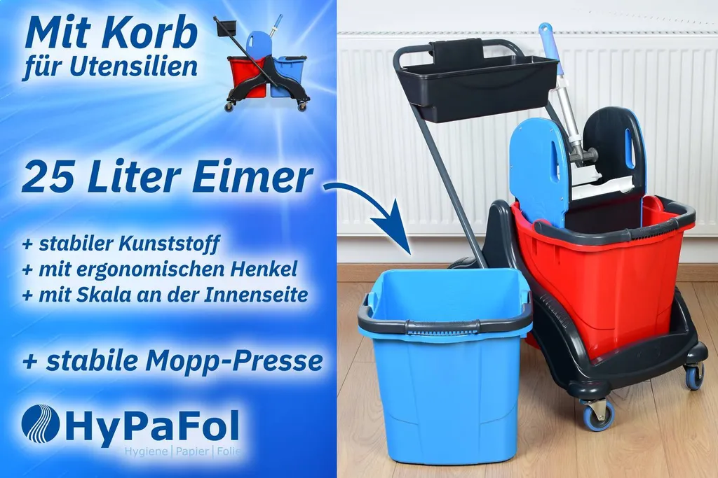 Schreibe die erste Rezension für „Hypafol Putzwagen Mit Korb | Reinigungswagen Set, 2 X 25 L Eimer Mit Presse Und Kehrgarnitur Inkl. 2x 50cm Baumwoll Wischmopp, 1x Mikrofaser-Mopp | Je 4 Mikrofasertücher | Für Gebäudereinigung, Hotelservice, Gastronomie, Großküche“ Antwort abbrechen