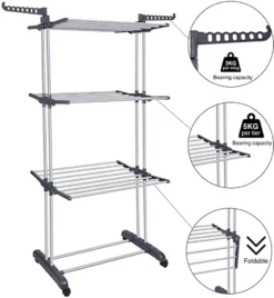 Bigzzia 3 Ebene Klappbarer Wäscheständer Mit Rädern Aus Rostfreiem Stahl, Grau